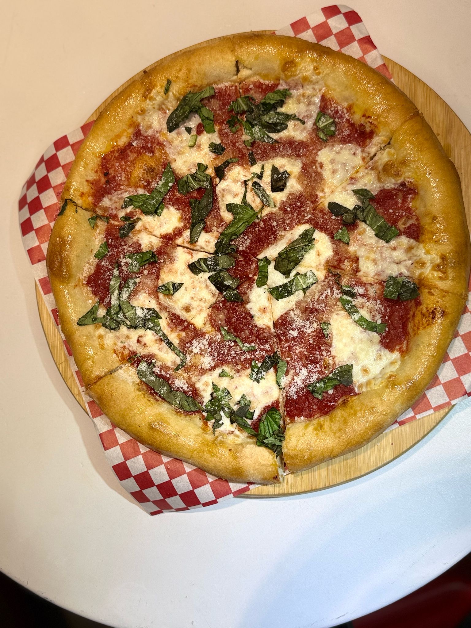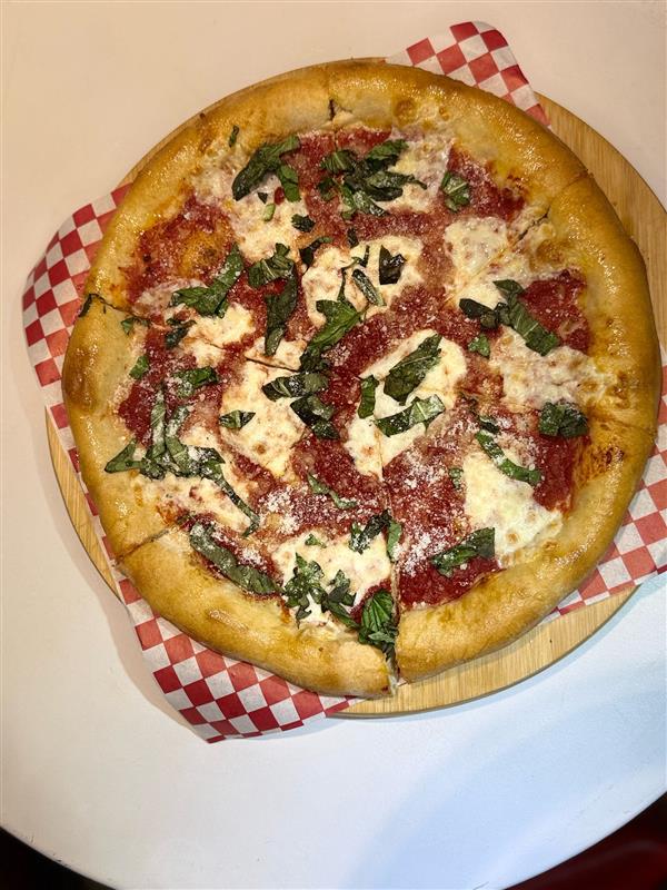 Tomato sauce, fresh mozzarella, fresh basil & evoo
